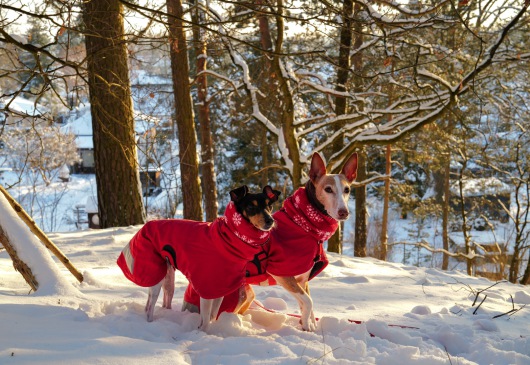 Lilly & Lisa sind da etwas wählerischer, man muss die beiden immer etwas überreden, wenn man die Hundemäntel fröhlich in der Hand hält und gleichzeitig Spiel & Sport verspricht. Hunde denken