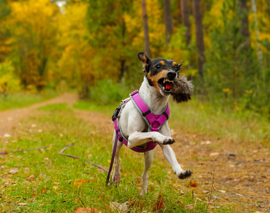 (P.S.: Lilly zeigt hier ihre Zähne natürlich nur, weil sie begeistert den Felldummy hält, bis sich der Futterbeutel öffnet.)
